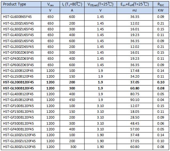 Homray Semiconductor Technology high power IGBT modules are designed for 600V/650V, 1200V and 1700V with rated current range 10A - 800A. HST-GL200B120F45 can replacing Infineon IGBT Module FF200R120KE3/KT3/KE4. HST-GL300B120F45 can replacing Infineon IGBT FF300R120KE3/KT3/KE4. IGBT Power Module are used in various applications such as AC and DC motor drives, Unregulated Power Supply (UPS), Switch Mode Power Supplies (SMPS), traction motor control and induction heating, inverters, used to combine an isolated-gate FET for the control input and a bipolar power transistor as a switch in a single device, etc.